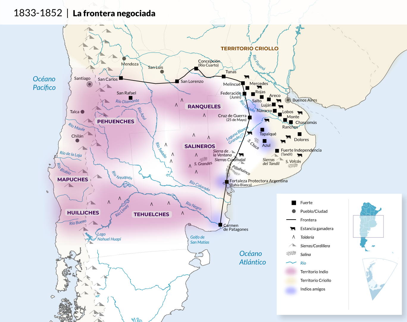 1833-1852. En estas dos décadas se multiplicó la llegada de grupos mapuche a las pampas. Venían desde los valles andinos y el oeste de la Cordillera. El gobernador de Buenos Aires, Juan Manuel de Rosas, realizó una campaña hasta el río Negro (1833-1834) para marcar la presencia criolla en esas tierras. Un logro importante fue el “negocio pacífico de indios”, sostenido en acuerdos de paz. Los “indios amigos” quedaron instalados dentro del territorio provincial. Los “indios aliados”, como Calfucurá y otros caciques, se comprometieron a mantener la tranquilidad de la frontera. De ese modo, hasta 1852 hubo una relativa paz entre criollos e “indios”. Fuente del mapa: Archivo DGCyE (información de base: L. Canciani e I. de Jong).