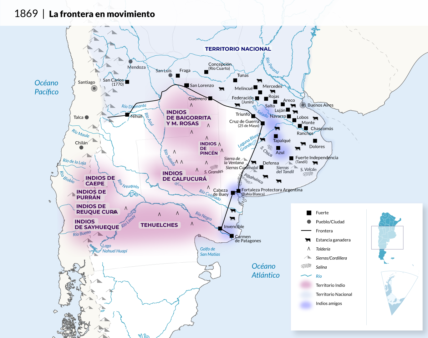 - “El fin de la frontera”. Es el dominio blanco definitivo de las tierras al norte de los ríos Negro y Neuquén que se concretó a partir de la expulsión, el arrinconamiento o el exterminio de los pueblos indígenas que estaban allí instalados. Ese final estuvo especialmente impulsado por los ataques que debilitaron las tolderías en los tiempos de Adolfo Alsina y por la siguiente campaña de Julio Roca. El acelerado avance del Ejército Nacional aparece indicado en el mapa de 1879.
