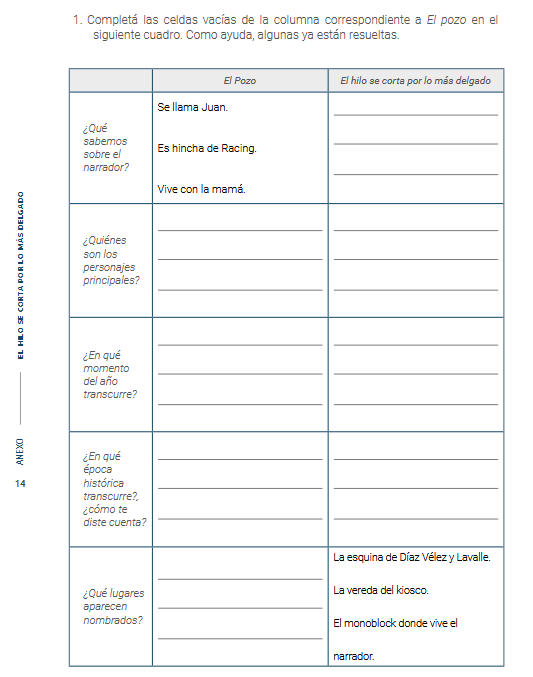 - Por último, también podemos comparar dónde ocurren ambas historias. En el caso de “El hilo se corta por lo más delgado”, dijimos que tiene lugar en un barrio de monoblocks en Avellaneda, muy cerca de la cancha de Racing Club. ¿Dónde transcurre la historia que se cuenta en “El pozo”? Les vuelvo a leer algunos pasajes: