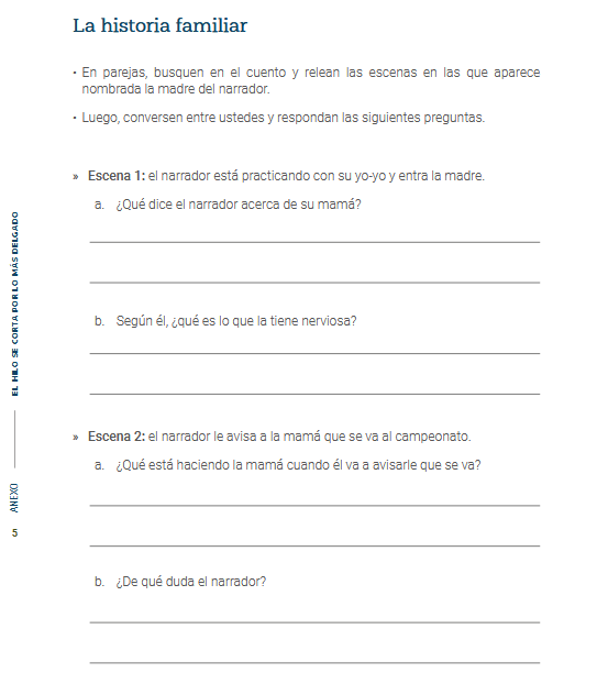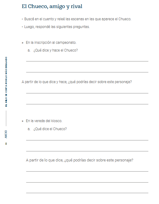 En la sección Recursos es posible acceder al cuento El hilo se corta por lo más delgado de Juan Sebastián Ronchetti. A su vez, en el apartado de materiales complementarios se dispone del anexo para el trabajo de las y los estudiantes.