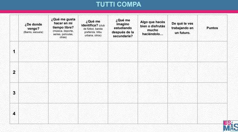 ➔ El sentido de la propuesta es conocerse entre pares a partir del barrio en el que viven, la escuela primaria a la que asistieron, los gustos y preferencias respecto a la música y el deporte, y las proyecciones de futuro hacia un trabajo o profesión.