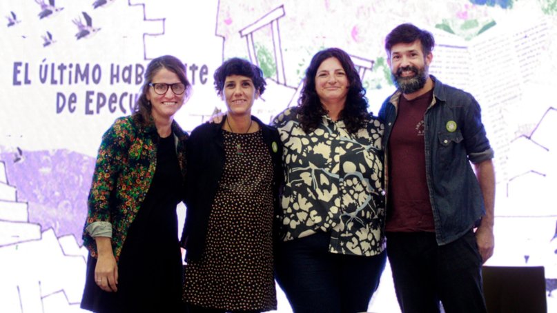 El equipo de trabajo que intervino en la producción de El último habitante de Epecuén: María Julia Poiré (autoría), Gustavo García y Maricel Schiebelbain (ilustraciones) y Josefina De Dominicis (diseño gráfico y edición).