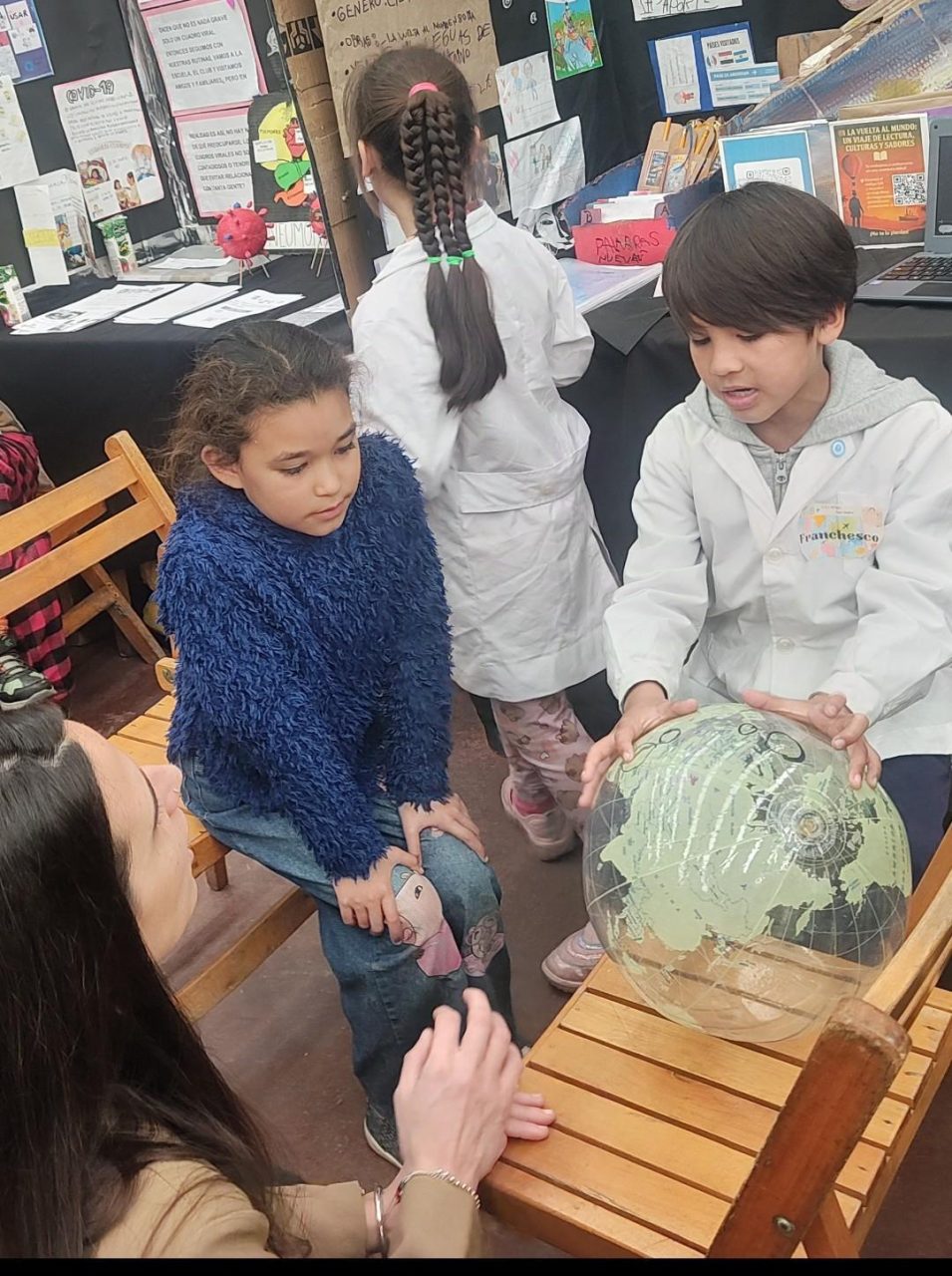 El globo terráqueo como soporte para la narración oral de los viajes. CEC 801 de San Isidro. Fuente: Archivo DGCyE.