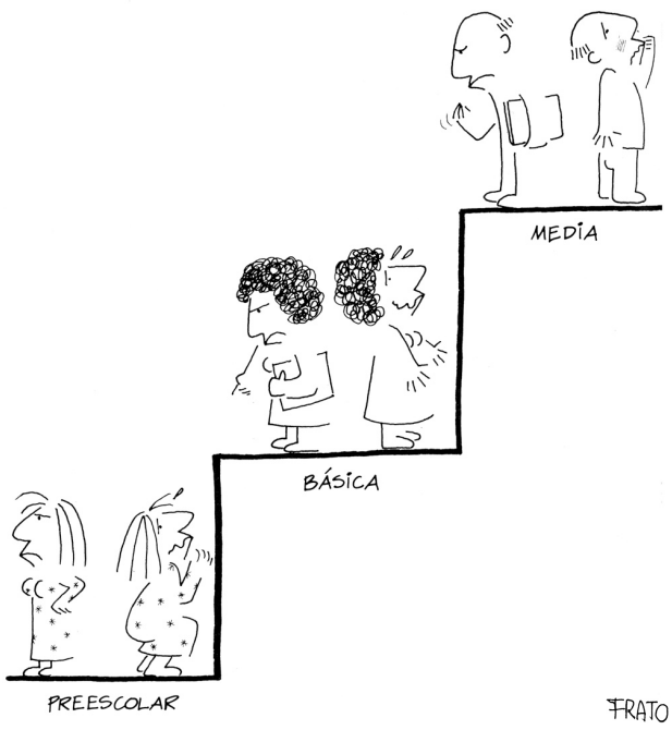 La imagen de la escalera posibilita interpelar ciertas percepciones fuertemente arraigadas sobre el sistema educativo en su conjunto, por ejemplo, visibiliza las jerarquías instituidas entre los niveles y evidencia las desigualdades. Si se observa con atención puede inferirse que el saber disciplinar aparece representado como potestad de los varones y se concentra en la escuela secundaria, que trae consigo una marca histórica de origen fuertemente selectiva. Los rostros expresan enojo cuando miran hacia abajo y súplica cuando miran hacia arriba como si la culpa por alguna situación que pase siempre estuviese en otro lado.