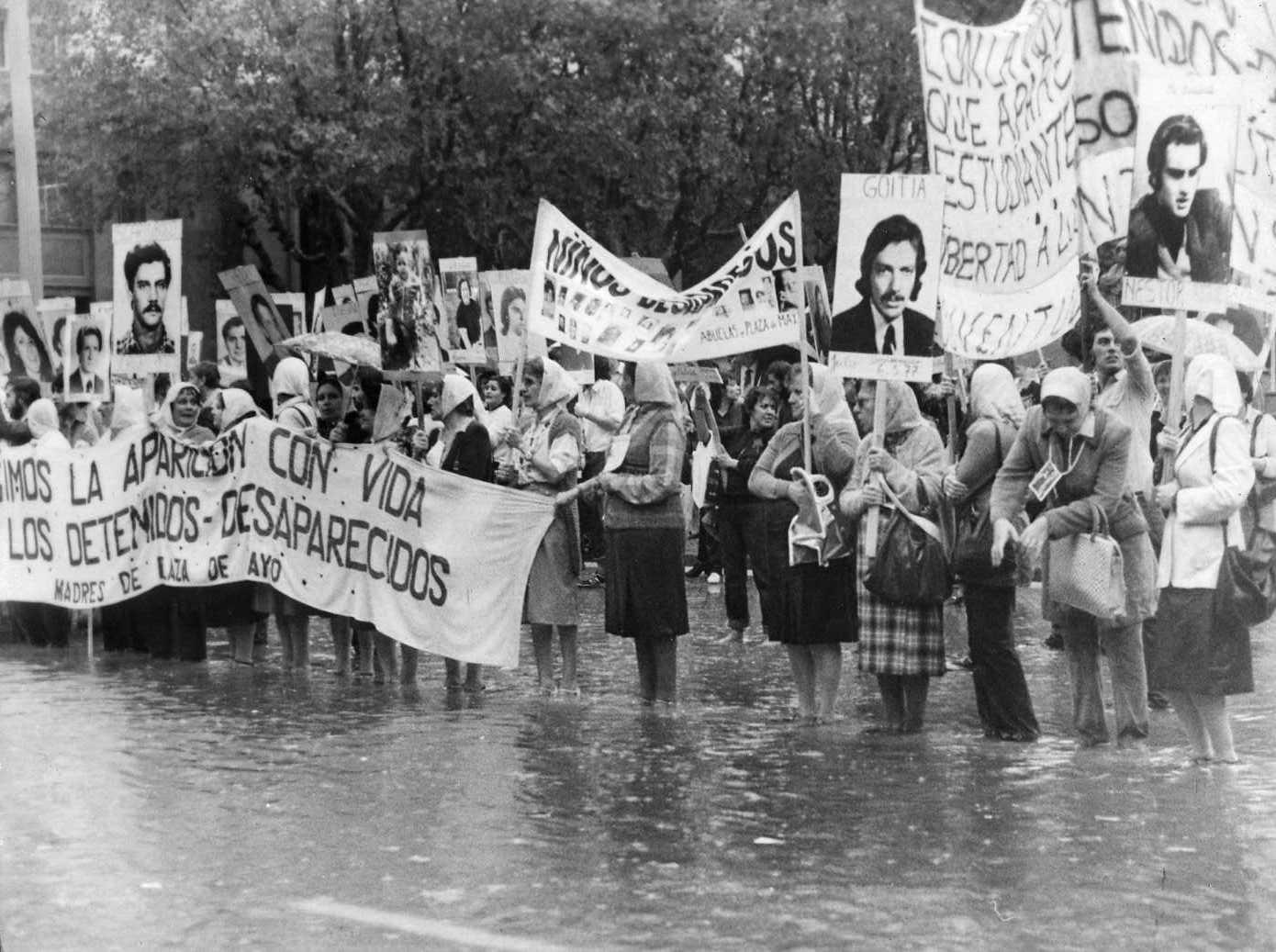 Familiares de desaparecidas y desaparecidos, como las Madres y Abuelas de Plaza de Mayo, fueron quienes motorizaron el reclamo de "Aparición con vida" en Argentina. En la imagen, aún durante la dictadura, se aprecia que no dejaron de movilizarse ni durante las peores inclemencias climáticas. Fuente: Fotografía de la colección Aída Sarti, en Memoria Abierta.